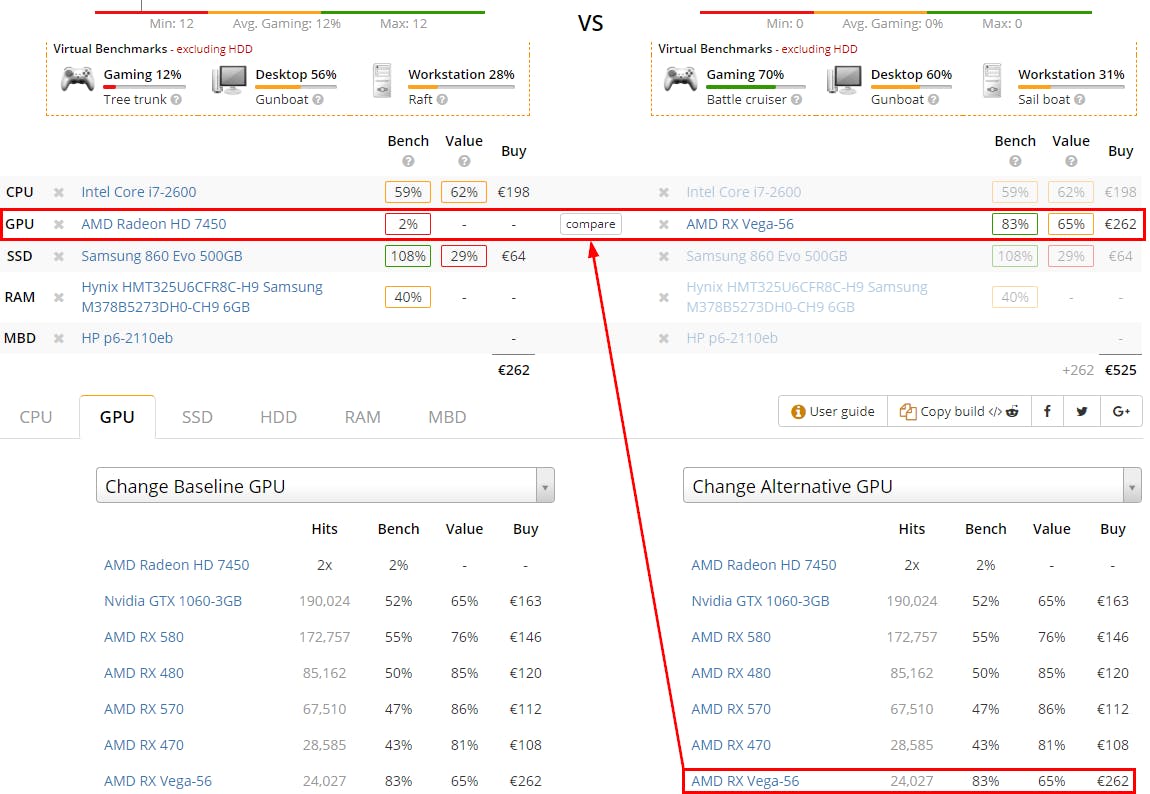 Nog lager op de pagina wordt het vooral interessant wanneer je overweegt een systeemcomponent te vervangen door een beter exemplaar. Klik daarvoor bij het onderdeel Custom PC Builder op Explore upgrades for this PC. Linksboven op de pagina vink je de huidige onderdelen van de geteste pc aan, rechtsboven de onderdelen van een mogelijk alternatief. Stel, je overweegt om de grafische kaart te vervangen. Open dan eerst het tabblad GPU – je vindt hier trouwens ook de tabbladen CPU, SSD, HDD, RAM en MBD (moederbord) terug - en klik dan bij Change Alternative GPU een alternatief model aan. Hierbij kan je kiezen wat je belangrijk vindt: de prestaties (Bench), de prijs (Buy) of de combinatie van prijs en prestatieverhouding (Value). Na de aanpassing, lees je bovenaan rechts wat zo’n upgrade je oplevert. Ook kun je je eigen onderdeel en je alternatief vergelijken via de Compare-knop. Zo krijg je een erg gedetailleerde vergelijking, op basis van de resultaten van (vaak vele duizenden) andere UBM-gebruikers. Heel leerzaam dus.