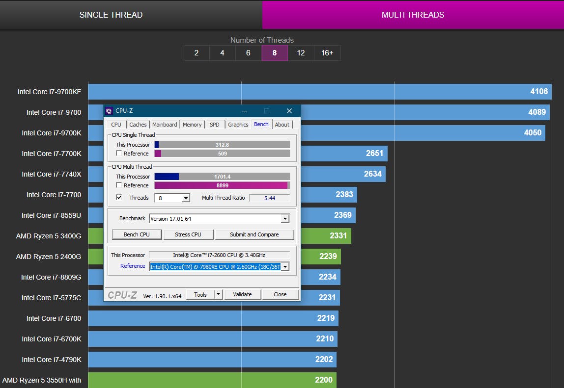 De eigenlijke benchmarks vind je op het tabblad Bench. Met Bench CPU start je de test en al na enkele seconden verschijnt het resultaat in de vorm van een getal, zowel bij Single Thread als bij Multi Thread. Bij die laatste kun je trouwens zelf het aantal simultane threads instellen. Wat het resultaat nou eigenlijk betekent, wordt duidelijker wanneer je bij Reference een andere cpu selecteert uit een modellenlijst om mee te vergelijken. Je merkt dan meteen hoe goed je eigen cpu boert. Je kunt met nog veel meer cpu’s vergelijken via https://valid.x86.fr/bench/<x>, waarbij je <x> vervangt door een cijfer tussen 1 en 16, afhankelijk van het aantal simultane threads waarmee je wil vergelijken (bijvoorbeeld: https://valid.x86.fr/8).