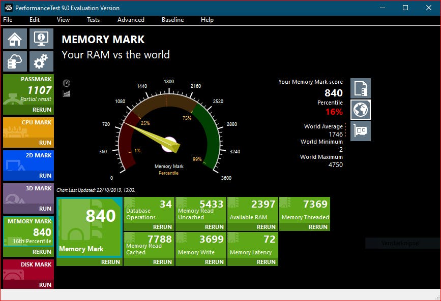 Een benchmarker die ook het ram-geheugen goed aan de tand voelt, is PassMark Performance Test (30 dagen gratis proef). Start de tool en druk op de knop Memory Mark. Die bestaat uit zeven tests die je allemaal in één keer of elk afzonderlijk kunt starten (via Run). Je vindt hier onder meer lees- en schrijftests, een latentietest en enkele intensieve database-operaties.