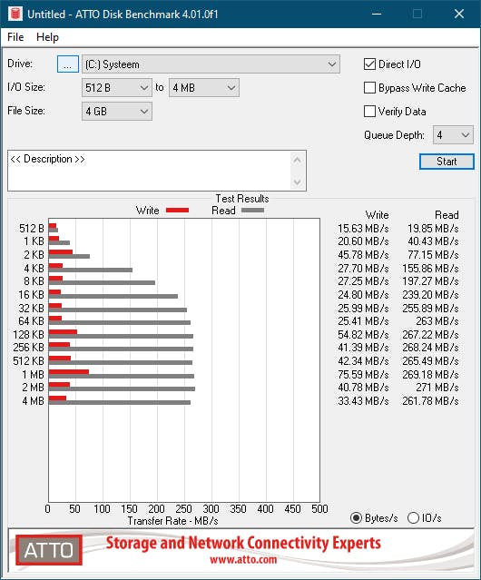 Na afloop verschijnt de overdrachtssnelheid in aantal blokken per seconde (IO/s), zowel voor lezen als schrijven. De makers verzamelen zelf geen resultaatgegevens, daardoor kun je je scores niet rechtstreeks met andere systemen vergelijken. Maar een Google-zoektocht naar bijvoorbeeld ‘atto disk benchmark results’ levert je wellicht bruikbaar vergelijkingsmateriaal op.