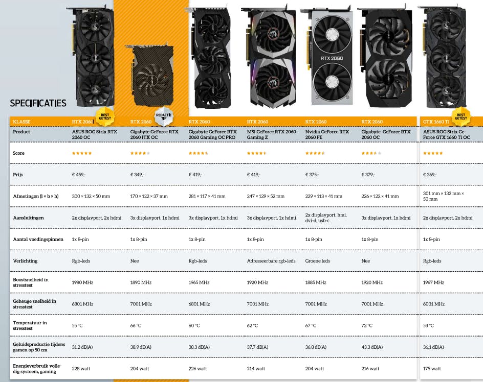 Dankzij Nvidia’s uitstekende ingebouwde automatische overklokfunctionaliteit zien we de laatste jaren bij het gamen eigenlijk nauwelijks meer prestatieverschillen tussen verschillende uitvoeringen van dezelfde kaart, en dit gaat ook op voor de RTX 2060, GTX 1660 Ti en GTX 1660. Dat zet vooral luxere modellen onder druk, omdat de nadruk in een vergelijking hierdoor enkel op warmte- en geluidsproductie komt te liggen (door zuinige chips zijn ook deze verschillen klein), met misschien nog wat aandacht voor de uitstraling en prijs.