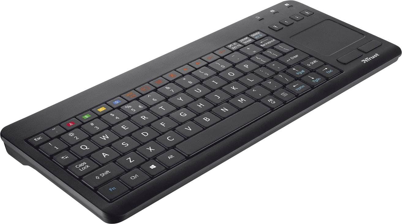 De Trust Sento is een toetsenbord dat er zo comfortabel uitziet dat we het waarschijnlijk ook zouden gebruiken voor onze pc, smartphone of tablet. Er is een groot typgedeelte en een klein trackpad-gedeelte, mocht het nodig zijn om bijvoorbeeld op je mediaspeler een cursor te bewegen. Het toetsenbord wordt geleverd met micro-usb-ontvanger met een draadloos bereik van 10 meter.