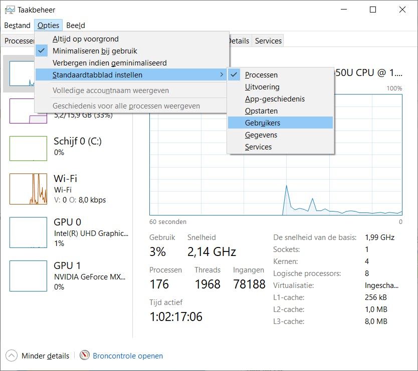 Het Windows-taakbeheer heeft een kleine wijziging ondergaan. Standaard opent Taakbeheer altijd met hetzelfde tabblad, namelijk bij het onderdeel waar de processen worden weergegeven. In de komende update van Windows 10 kun je aangeven met welk venster je Taakbeheer wilt opstarten, bijvoorbeeld de prestaties of services. Via het menu Opties en Standaardtabblad kun je het gewenste tabblad standaard maken.
