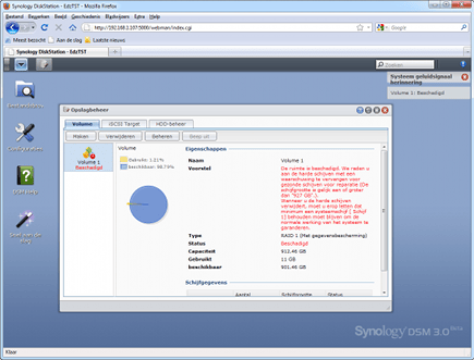 Kunt u het aantal schijven in de NAS nog uitbreiden en is het volgens de handleiding ook mogelijk, log dan via de webbrowser in op de NAS. Blader naar het volumebeheer en selecteer het volume. Kijk of de optie Wijzigen dan actief wordt. Klik dan op Wijzigen en kijk welke mogelijkheden er zijn. Selecteer de uitbreiding die u wilt uitvoeren en klik op OK of Volgende om de uitbreiding te starten. Soms kan het uitbreiden van het aantal schijven ook meerdere stappen betekenen. Bijvoorbeeld eerst van een installatie met één harde schijf naar een RAID1 met twee harde schijven en pas daarna naar een RAID5 met vier harde schijven. Dit is weer afhankelijk van de mogelijkheden die de firmware biedt en de huidige installatie. Reken erop dat elke uitbreiding vele uren kan duren doordat de NAS de schijven helemaal opnieuw moet indelen en controleren op fouten. Gedurende die tijd kan de NAS niet voor andere functies worden gebruikt.