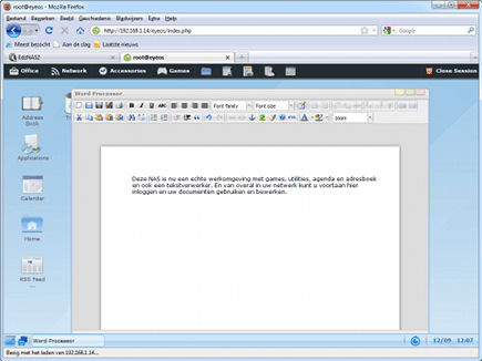 Na de installatie van eyeOS zal opnieuw een loginscherm verschijnen. Log daar in met gebruikersnaam root en het wachtwoord dat u zojuist hebt ingesteld voor dit account. Klik dan op Enter. EyeOS is een 'cloud-besturingssysteem' dat van de QNAP NAS een soort terminal server maakt, oftewel een server waarmee u via de browser contact kunt maken om dan op de NAS te gaan werken. En op die NAS staan nu als onderdeel van eyeOS een groot aantal programma's, applicaties, games en utilities waardoor het binnen de webbrowser van eyeOS net zo makkelijk werken is als op een notebook. U hebt er nu gewoon uw eigen werkomgeving. Klik bijvoorbeeld linksboven op Office, WordProcessor en u start op de NAS een eigen tekstverwerker. En documenten bewaart u rechtstreeks op de NAS! Uitloggen doet u via een klik op Close Session.