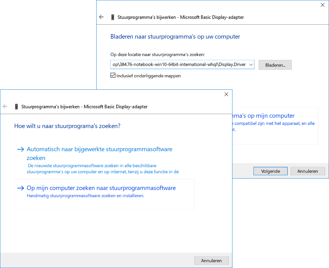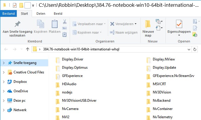 Download eerst het originele installatiebestand voor je videokaart. Als je niet weet welke type videoadapter je hebt kijk je bij Windows-toets+Pause / Apparaatbeheer / Beeldschermadapters. Bewaar het installatiebestand, maar voer het niet uit. Onze testlaptop heeft een nVidia GTX 660M. Het installatiebestand hiervan heet 384.76-notebook-win10-64bit-international-whql.exe. Dit lijkt een uitvoerbaar bestand, maar is feitelijk een zelfuitpakkend archiefbestand. Dubbelklik om het uit te pakken, of gebruik Winrar of een vergelijkbaar programma om de inhoud handmatig uit te pakken. Meestal kan dit via de rechtermuisknop en dan de optie Extract of Uitpakken.