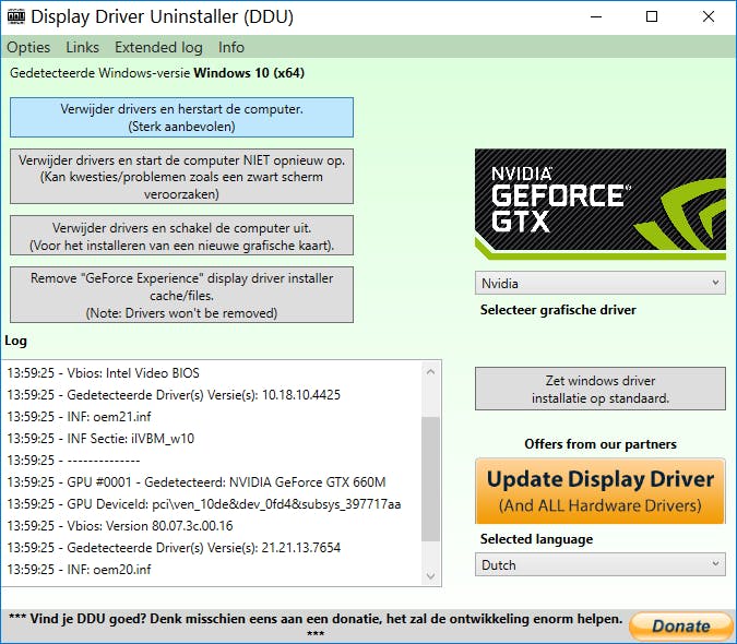 Start DDU en laat je pc opnieuw opstarten in veilige modus. DDU wordt automatisch actief waarna je met Verwijder drivers en herstart de computer je systeem grondig schoont van overgebleven nVidia-resten. DDU maakt een Windows-herstelpunt aan (wel zo veilig!) en voert de schoonmaakactie uit. Zodra je pc weer is opgestart ga je via Windows-toets+Pause naar Apparaatbeheer en open je Beeldschermadapters.