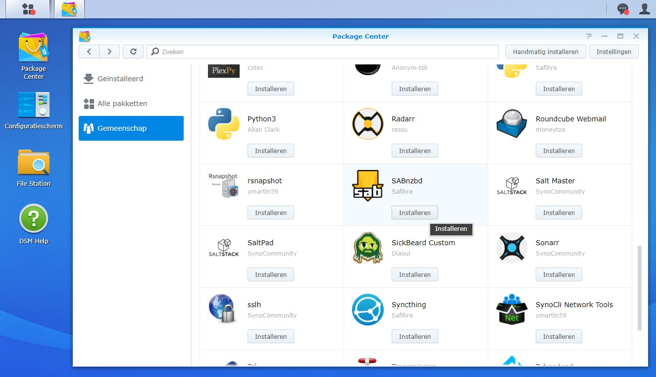 Binnen het Package Center bekijk je bij Gemeenschap een overzicht met beschikbare (download)tools. Vanzelfsprekend klik je onder SABnzbd op Installeren. Er verschijnt een melding dat je hiermee automatisch de programmeertaal Python aan je nas toevoegt. Voordat de installatie begint, creëert DSM zo nodig een nieuwe map voor je downloads. Na de installatie verschijnt er binnen het hoofdmenu een snelkoppeling.