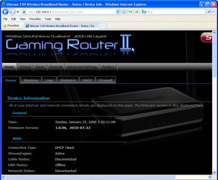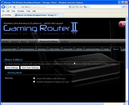 De webinterface van de Sitecom is even wennen in vergelijking met de andere routers, want het geheel is nogal donker en zwart. In het scherm voor de firewall vinden we de voor gamers belangrijke opties voor Virtual Servers en Special Applications die de firewall eenvoudig aanpassen aan de programma’s die internet nodig hebben. Het delen van een usb-schijf verloopt wat minder intuïtief, maar uiteindelijk is het met een paar klikken voor elkaar. In de interface zien we geen mogelijkheid om printers te delen via het netwerk.