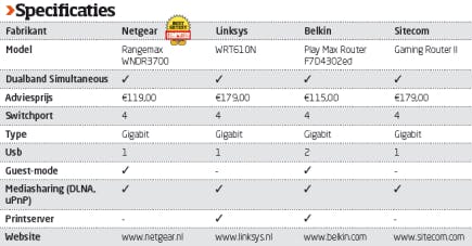 De in deze test besproken routers beschikken op papier over het beste van twee werelden. Het zijn alle vier zogenaamde dualbandrouters, die communicatie op beide frequenties tegelijk ondersteunen. Uw nieuwe laptop of externe netwerkadapter kan gebruikmaken van de snelle en rustige 5GHz-frequentie, terwijl uw mobiele telefoon, spelcomputer en oudere computers communiceren via de 2,4GHz-band. Het resultaat? Op papier supersnelle verbindingen, vooral als het gaat om het transporteren van video of het spelen van games. Want los van de dualbandstack hebben de in deze test besproken routers nog veel meer gemeen. Zo beschikken ze allemaal over een vorm van traffic shaping, een techniek die de efficiëntie van het netwerk kan verbeteren door bepaalde verkeersstromen voorrang te geven. Bij Sitecom heet dit de StreamEngine, Belkin noemt het Bit Boost en de techniek blijft zonder verdere vermelding bij Linksys/Cisco en Netgear. Ook de hardware lijkt erg op elkaar: alle routers beschikken over vier gigabitpoorten voor computers die met een kabel verbonden moeten worden en ze hebben één of meerdere usb-poorten voor het aansluiten van een externe harde schijf, waarmee ze audio en video kunnen streamen naar compatibele apparaten of in sommige gevallen een printer kunnen delen.