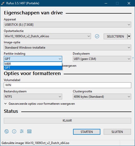 Het is nu de bedoeling dat je Windows op een opstartbare usb-stick krijgt. Gaat het om de actuele versie van Windows 10 dan ga je best aan de slag met Media Creation Tool: die haalt namelijk in één keer Windows op en zet die vervolgens netjes op een usb-stick. Heb je zelf al een Windows iso-bestand opgehaald (zie bij ‘01 Schijfkopiebestand’) dan kun het gratis Rufus downloaden. Stop een usb-stick in je pc, start Rufus op en verwijs naar de stick. Bij Opstartselectie kies je Schijf of ISO-image (selecteren) en verwijs je met de knop SELECTEREN naar je iso-beeldbestand. Afhankelijk van het toestel dat je via deze stick wilt opstarten kies je bij Partitie-indeling en Doelsysteem ofwel GPT en UEFI (geen CSM), ofwel MBR en BIOS (of UEFI-CSM) (zie ook ‘08 Bios of uefi’). De andere optie kun je het beste ongemoeid laten. Bevestig met STARTEN en met OK (twee maal). Zodra de melding ‘Klaar’ verschijnt, mag je op SLUITEN klikken.