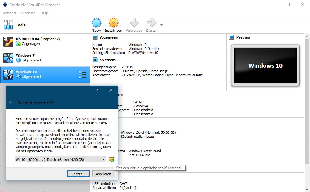 Download VirtualBox op www.virtualbox.org en installeer de tool. Wanneer je vervolgens het programma opstart beland je in een nog lege beheermodule. Druk dus op de knop Nieuw en vul een naam in voor je virtuele machine (vm). Selecteer het correcte OS Type (zoals Microsoft Windows of Linux) evenals de juiste versie. Bij Machine Folder geef je aan waar je vm terecht mag komen. Vervolgens duid je de nodige hoeveelheid ram-geheugen aan. Als laatste zorg je dat Maak nieuwe virtuele harde schijf nu aan geselecteerd staat en bevestig je met Aanmaken. Laat het type ingesteld op VDI, druk op Volgende en selecteer bij voorkeur Dynamisch gealloceerd. Leg de (maximum)grootte van je virtuele schijf vast – bijvoorbeeld 15 GB voor Linux en 30 GB voor Windows – en rond af met Aanmaken. In de beheermodule selecteer je vervolgens de vm en druk je op Starten. Klik op het pictogram Kies een virtuele optische schijfbestand en verwijs naar je gedownloade iso-bestand. Druk op Start voor de virtuele installatie van het OS en volg de instructies. Na afloop laat het virtuele OS zich vanuit de beheermodule van VirtualBox opstarten. Via de knop Instellingen pas je desgewenst allerlei eigenschappen van je vm aan.