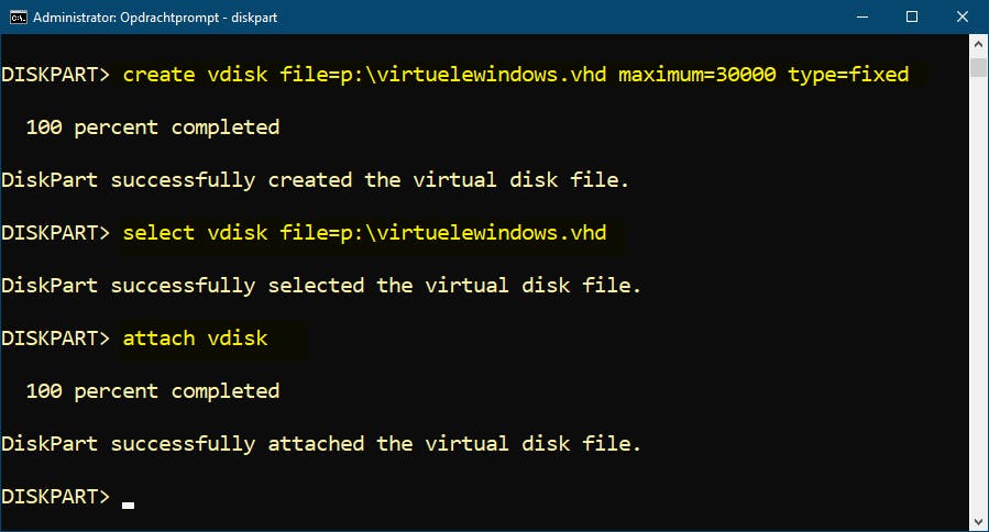 (met detach vdisk kun je de schijf als je wilt weer ontkoppelen).