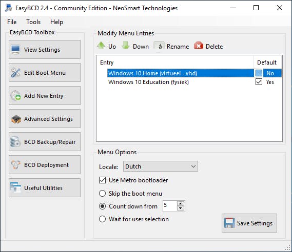 Als het goed is krijg je bij het herstarten van je pc voortaan een opstartmenu te zien met naast je fysieke Windows-installatie ook de virtuele op je vhd-schijf. Met EasyBCD kun je makkelijk sleutelen aan dit opstartmenu en bijvoorbeeld de standaard opstartvolgorde of de time-out aanpassen; dat kan via de knop Edit Boot Menu.