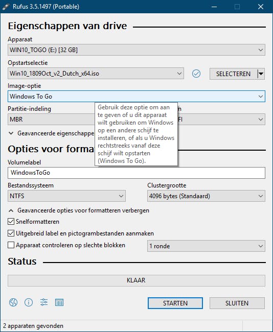Precies zo’n tool hebben we al vermeld bij ‘02 Installatiestick’, namelijk Rufus. Je gaat op dezelfde manier te werk als we daar hebben beschreven, alleen kies je Windows To Go in het uitklapmenu bij Image-optie (in plaats van Standaard Windows-installatie); deze optie hoort beschikbaar te zijn in Windows 8, 8.1 en 10. Idealiter gebruik je een stick die voor Windows To Go is gecertificeerd, maar hoe dan ook moet die minstens 16 GB groot zijn. Wil je van de stick op kunnen starten op een systeem met een klassiek bios, kies dan MBR als Partitie-indeling; in het andere geval kun je voor GPT opteren. Stel het Bestandssysteem in op NTFS met een Standaard Clustergrootte. Verwijs naar je Windows 10 iso-bestand en bevestig met Starten en met OK (twee maal). Dit proces kan erg lang duren, maar als het goed is heb je na afloop wel Windows op een stokje.