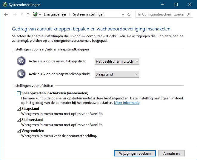 We raden je aan om voordat je met je dualboot-installatie begint eerst een functie in Windows 10 uit te schakelen die ervoor zorgt dat het OS bij het opstarten in een soort slaapstand gaat. Deze functie kan namelijk problemen opleveren in een dualboot-scenario. Druk op de Windows-toets, tik configuratie in, start Configuratiescherm en kies Systeem en beveiliging / Het gedrag van de aan/uit-knoppen wijzigen bij Energiebeheer. Klik op Instellingen wijzigen die momenteel niet beschikbaar zijn en verwijder het vinkje bij Snel opstarten inschakelen. Bevestig met Wijzigingen opslaan.