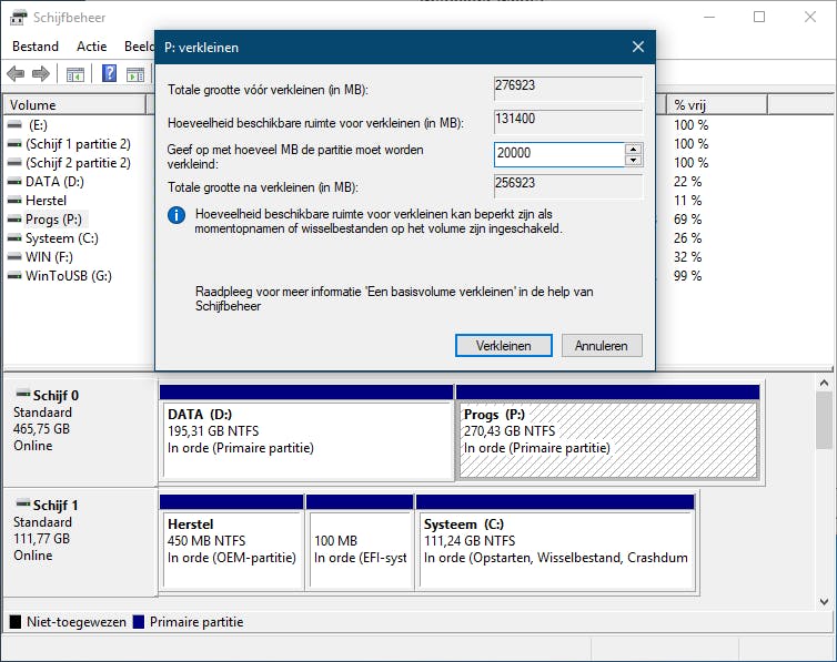 Je moet er uiteraard ook voor zorgen dat er voldoende vrije schijfruimte is voor de fysieke partitie van het extra OS. Dat check je snel door Windows-toets+R in te drukken en diskmgmt.msc uit te voeren. Heb je onvoldoende niet-toegewezen ruimte – voor Ubuntu heb je pakweg 15 GB nodig – dan zit er wellicht weinig anders op dan een al bestaande partitie te verkleinen. Dat kan door de partitie in de grafische weergave met de rechtermuisknop aan te klikken en Volume verkleinen te kiezen. Geef aan met hoeveel MB je die wilt verkleinen, bijvoorbeeld 15000. Bevestig met Verkleinen.