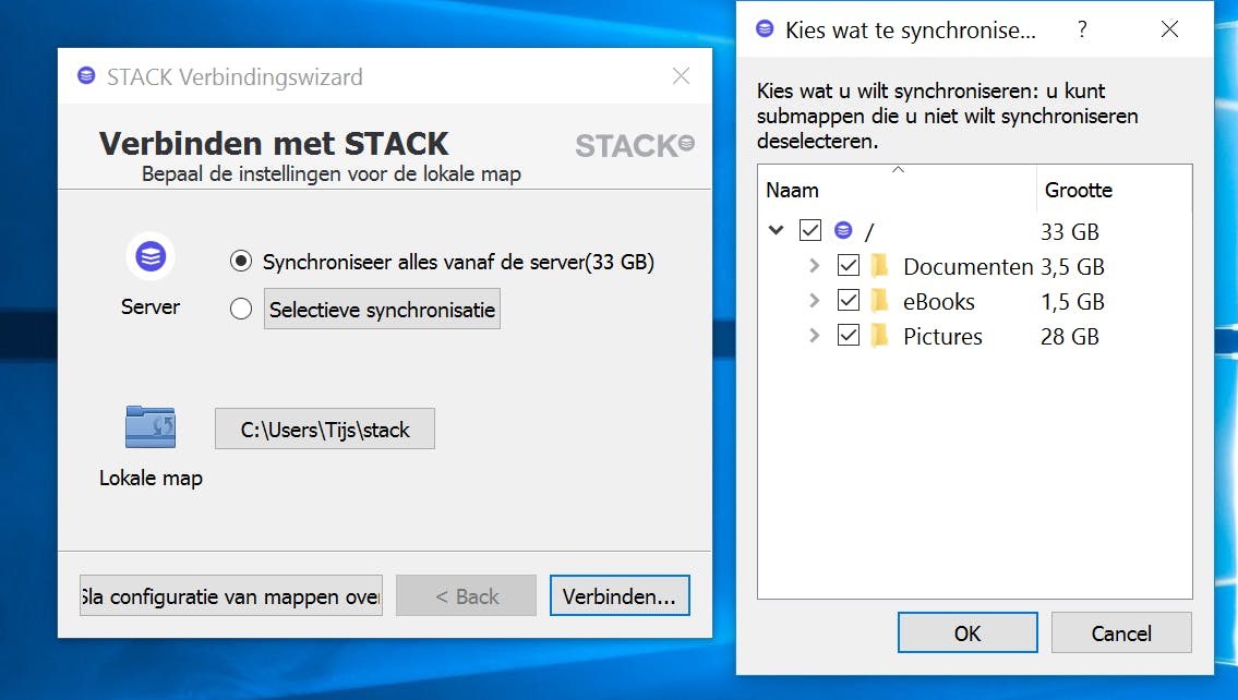 Vul bij het instellen van Stack het aangemaakte webadres in (jouwnaam. stackstorage.com). Ook heb je hier je gebruikersnaam en wachtwoord nodig. Als je bent ingelogd, kun je instellen welke mappen je wilt synchroniseren met Stack. Met 'Selectieve synchronisatie' kies je de mappen, maar je kunt dit ook naderhand doen. Als je nu in je browser kijkt, zie je dat Stack gesynchroniseerd is met je Verkenner. Op die manier kun je niet alleen bepaalde mappen synchroniseren, maar kun je ook handmatig documenten toevoegen aan je Stack-opslag.