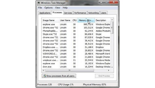 Zo niet, ga terug naar het tabblad Processes, klik op de kolomkop Memory en kijk of je de boosdoener op die manier kunt vinden.