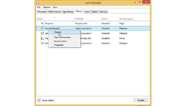 Als je Windows 8 gebruikt, klik dan met de rechtermuisknop op de taakbalk en selecteer Start Task Manager. Als je een tabblad met de naam Startup te zien krijgt, klik erop. Zo niet, klik dan op More details > Startup. Om een item uit te schakelen moet je er met de rechtermuisknop op klikken en Disable selecteren.