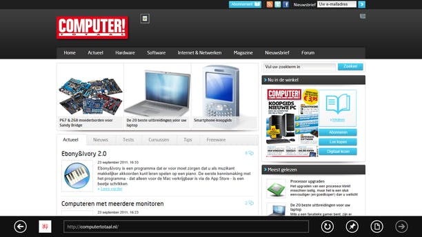 In de testversie van Windows 8 is ook een voorproefje te vinden van de tiende versie van Internet Explorer. De browser is helemaal klaargestoomd voor gebruik met de tablet. De navigatiebalk is naar beneden verplaatst en schuift automatisch weg. Bovenin schuift een tabbladenoverzicht naar beneden. Ook de beginpagina is weergegeven met grote vlakken die leiden naar gepinde (favoriete) en naar meest bezochte websites. De bètaversie van Internet Explorer 10 is op het moment van schrijven helaas nog niet los te installeren op een ander systeem.
