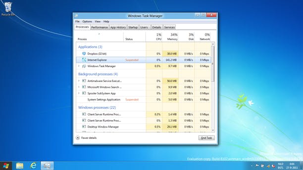 Wanneer u Windows 8 geïnstalleerd hebt, merkt u wellicht dat er minder stroom verbruikt wordt. Dit komt niet alleen door de lagere systeemeisen, maar ook omdat applicaties 'suspended' (opgeschort) worden wanneer u ze niet gebruikt. Dit houdt in dat ze niet meer actief op de achtergrond draaien, maar in het geheugen geladen worden. In het gebruik van de applicaties merkt u geen verschil, maar de processor wordt hiermee wel ontlast, wat de batterijduur ten goede komt. Wanneer u naar Taakbeheer gaat, ziet u dat dit onderdeel flink onder handen genomen is, het lijkt wel een fraai opgemaakt Excel-document. Het Taakbeheer geeft nu in één keer overzichtelijk weer of het proces opgeschort is en hoeveel cpu, geheugen, schijfschrijfsnelheid en netwerkbezetting het in beslag neemt. Processen die bovengemiddeld afsnoepen van een systeemonderdeel vallen op vanwege de donkere kleuren. Tabbladen bovenin leiden naar onder andere de performancegrafieken (zoals u die gewend bent), een overzicht van verbruikte systeemcapaciteit per app, en processen die met Windows opstarten. Het Taakbeheer en de 'suspended' applicaties zitten zo goed doordacht in elkaar, dat u eigenlijk niet meer zonder wilt.