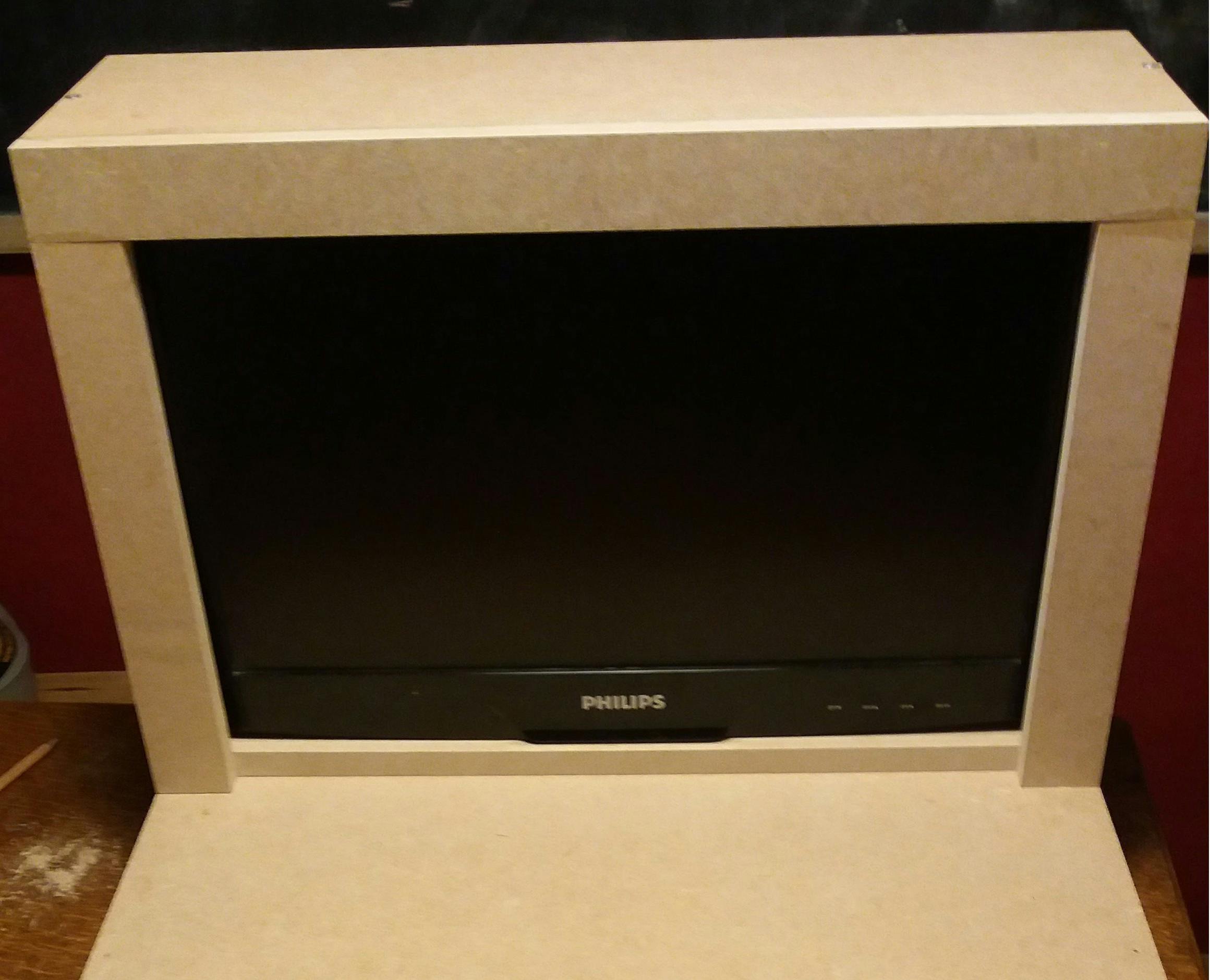 De kast is bedoeld om op tafel te staan en het geheel mag niet te groot zijn. Het ontwerp van mijn arcadekast is relatief eenvoudig. Het heeft geen schuine kanten en bestaat uit twee onderdelen. De bovenkant is een raamwerk voor het beeldscherm waar weinig speling is om heen en weer te bewegen. Aan de voorkant is er een rand waardoor het beeldscherm niet naar voren kan en tegen de achterkant van het beeldscherm is nog een balk om het geheel op z’n plaats te houden.