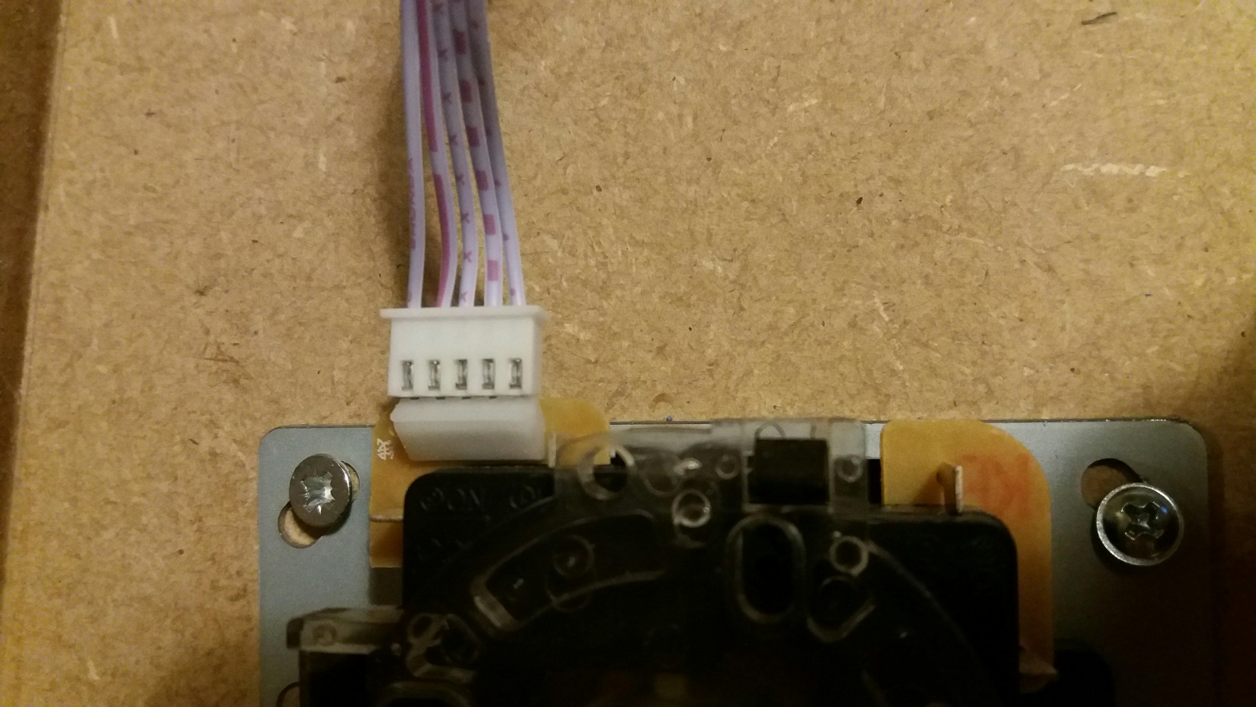 Voor de joystick heb ik een ruim gat gemaakt omdat de pook genoeg bewegingsruimte nodig heeft. Bij de knoppen bijgeleverd is een printplaat met stekkertjes erop gemonteerd. Elke knop heeft een kabel met aan één kant de bijpassende connector en een kant waar de knop twee draden met een metalen connector heeft die je op de knopaansluitingen schuift.