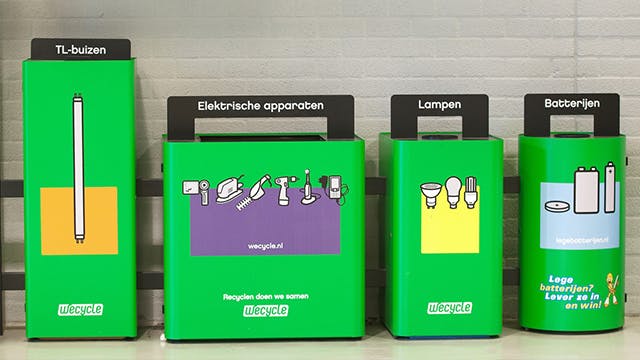 Wecycle heeft in Nederland zo’n 10.000 verzamelpunten, waarvan er ongeveer 2.500 bij supermarkten staan. Wat mag je daar dan zoal inleveren? Bij supermarkten is de ruimte vaak beperkt: de verzamelbakken die daar geplaatst zijn, zijn geschikt voor bijvoorbeeld smartphones, rekenmachines, batterijen, klokken, lege cartridges, computermuizen etc.