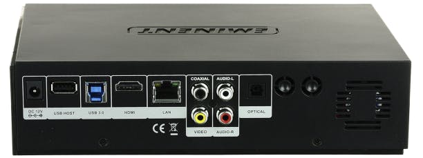 Met de vormgeving van de EM7280 lijkt Eminent geen enkel risico te willen nemen. De behuizing bestaat uit een zwarte rechthoekige doos, waardoor deze mediaspeler minder opvalt vergeleken met voorgaande modellen. Ook wat betreft de aansluitingen zien we verschillen. De component-uitgang en eSATA-poort zijn verdwenen, terwijl er nu wel ondersteuning is voor snelle data-overdracht via usb3.0-slave. Aan de onderkant bevestigt u eenvoudig een 3,5inch-schijf door een klepje open te schroeven. Overigens is de EM7280 ook te koop met een voorgemonteerde schijf. Een hoorbare ventilator zorgt dat de speler niet te heet wordt.