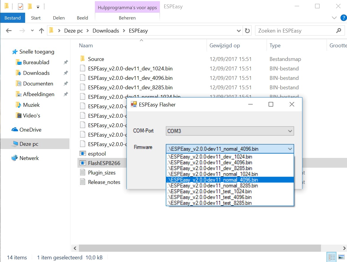 Op het moment van schrijven nemen de ontwikkelaars van ESP Easy hun firmware op de schop. We kiezen daarom niet voor de stabiele release, maar voor een ontwikkelversie van de volledig herschreven versie 2.0. Download het zipbestand (bij ons was dit ESPEasy_v2.0.0-dev11.zip, dat in de praktijk heel stabiel bleek) en pak het uit. Naast de broncode zie je er ook allerlei bin-bestanden. Dat is de binaire versie van de firmware. De namen maken duidelijk welke je nodig hebt: normal bevat alleen de stabiele plug-ins, test ook de testplug-ins en dev ook de plug-ins die nog in ontwikkeling zijn. 1024 is voor ESP-modules met 1 MB flash en 4096 voor ESP-modules zoals de ESP-12E met 4 MB flash.