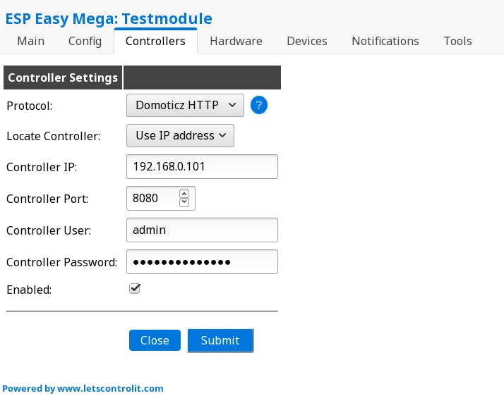 In het tabblad Controllers staat standaard al een controller toegevoegd met het protocol van Domoticz. Klik ernaast op Edit. Als protocol laat je Domoticz HTTP staan. Vul het ip-adres en de poort (standaard 8080) van je Domoticz-controller in. Heb je de webinterface van Domoticz afgeschermd met een gebruikersnaam en wachtwoord, vul die hier dan ook in. Vink tot slot Enabled aan en klik op Submit. Als je daarna op Close drukt, zie je je Domoticz-controller in de lijst met controllers staan.
