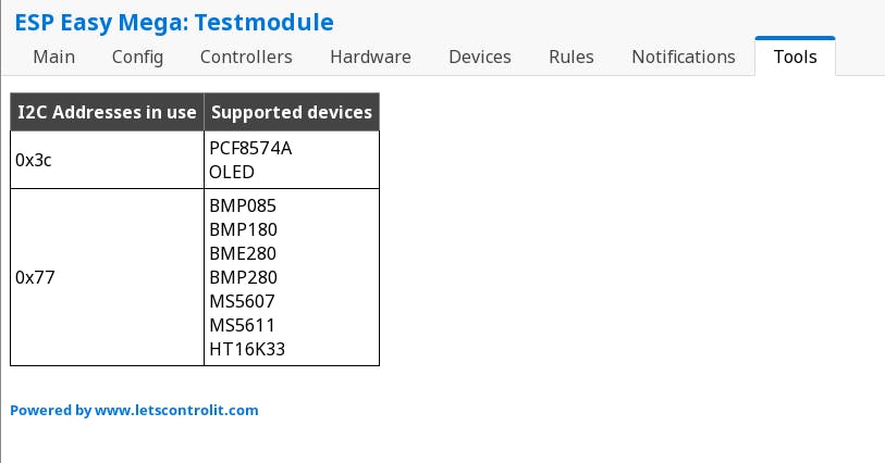 Dan rest ons alleen nog om het oled-schermpje te configureren zodat we de sensorgegevens ook daarop te zien krijgen. Klik eerst in het tabblad Tools op I2C Scan en kijk welk I2C-adres het oled-scherm gebruikt, standaard 0x3c. Maak daarna een derde apparaat aan in het tabblad Devices en kies als type Display - OLED SSD1306. Kies een naam, vink Enabled aan en controleer of het juiste I2C-adres ingevuld staat. Kies ook de juiste rotatie (normaal of ondersteboven) en schermgrootte.