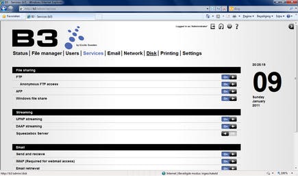 Een minpunt van de vorige NAS van Excito was de interface. Hier is overduidelijk hard aan gewerkt waardoor het er nu heel mooi uitziet met veel wit in de webinterface, duidelijke items om te klikken en een mooie klok en kalender op de startpagina.