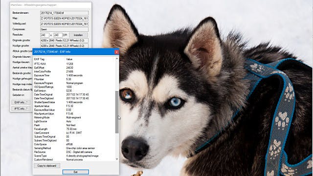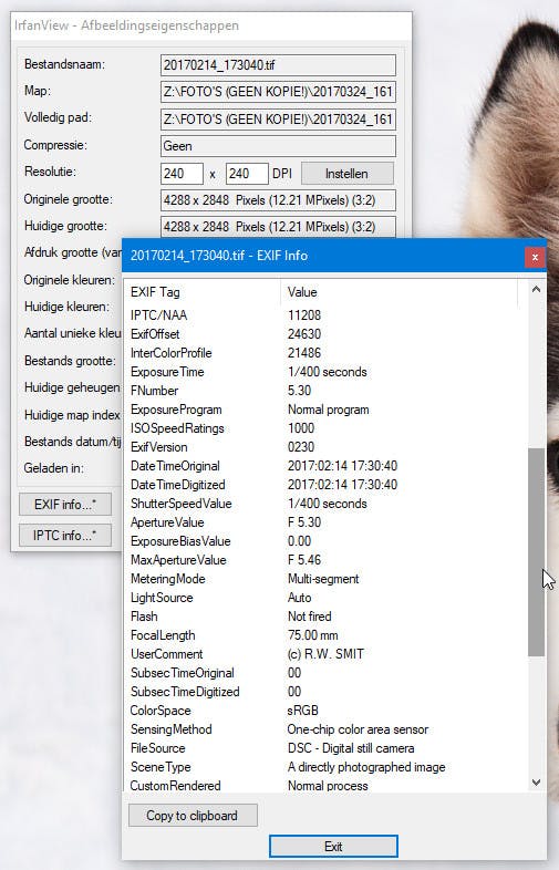 Verder zie je het gebruikte diafragma, datum en tijdstip van de opname en de naam van de fotograaf. Dat laatste trucje werkt alleen als je die naam op de camera hebt ingevoerd. Wil je de gegevens even op papier bekijken, dan klik je op de knop Copy to clipboard, om het geheel vervolgens in Kladblok of een tekstverwerker te plakken. Door goed te kijken naar met name zaken als sluitertijd, diafragma, al dan niet automatische witbalans enzovoort leer je snel wat er mis is gegaan bij het maken van een foto. Of juist heel goed.