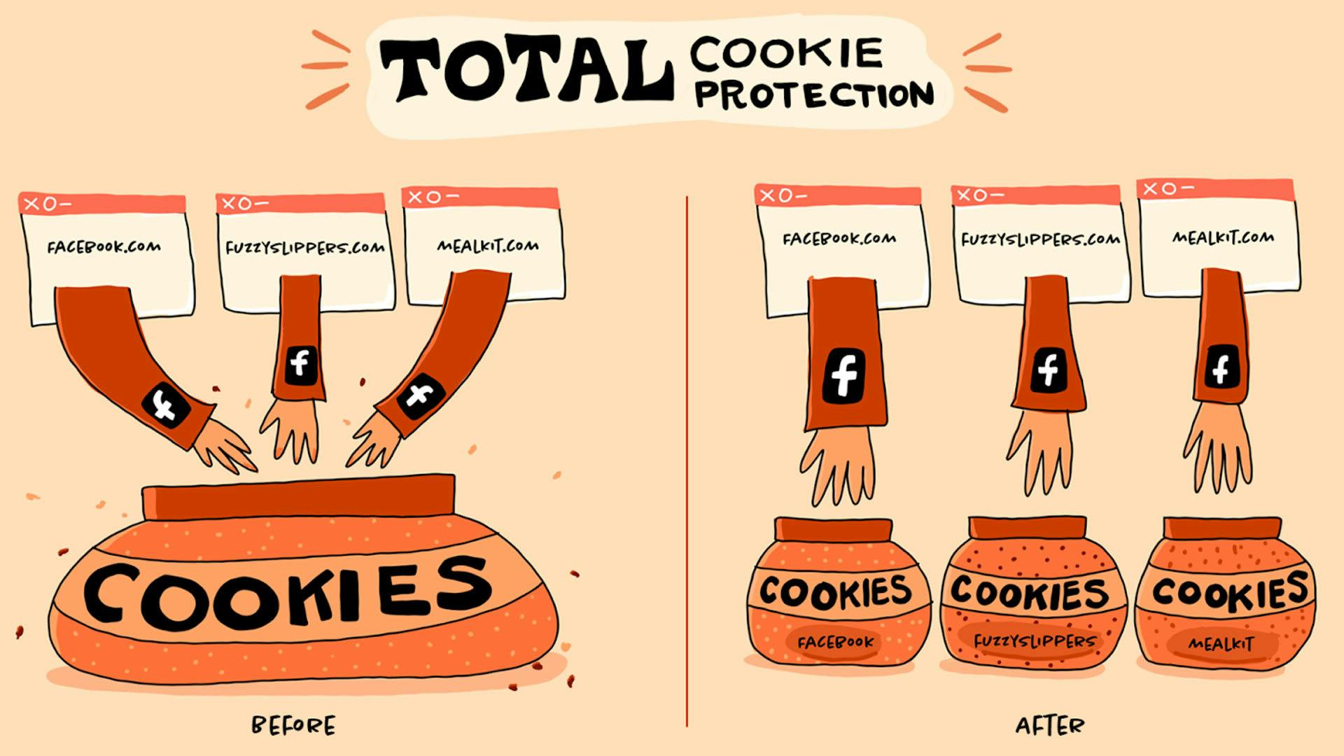 Alle cookies staan in feite onbeheerd op je pc, die dan als het ware fungeert als een grote koektrommel waar sites uit kunnen grijpen. Maar met de Total Cookie Protection verandert dat. Dan kunnen diensten, sites en winkels alleen bij de cookies die ze zelf achterlaten. Ze zien dus de cookies van andere partijen niet meer en kunnen gebruikers derhalve niet meer over het internet volgen. Daardoor verandert de grote koektrommel in allerlei kleine koektrommels. Diensten, sites en winkels die cookies achterlaten grijpen voortaan alleen nog maar uit hun eigen koektrommel.