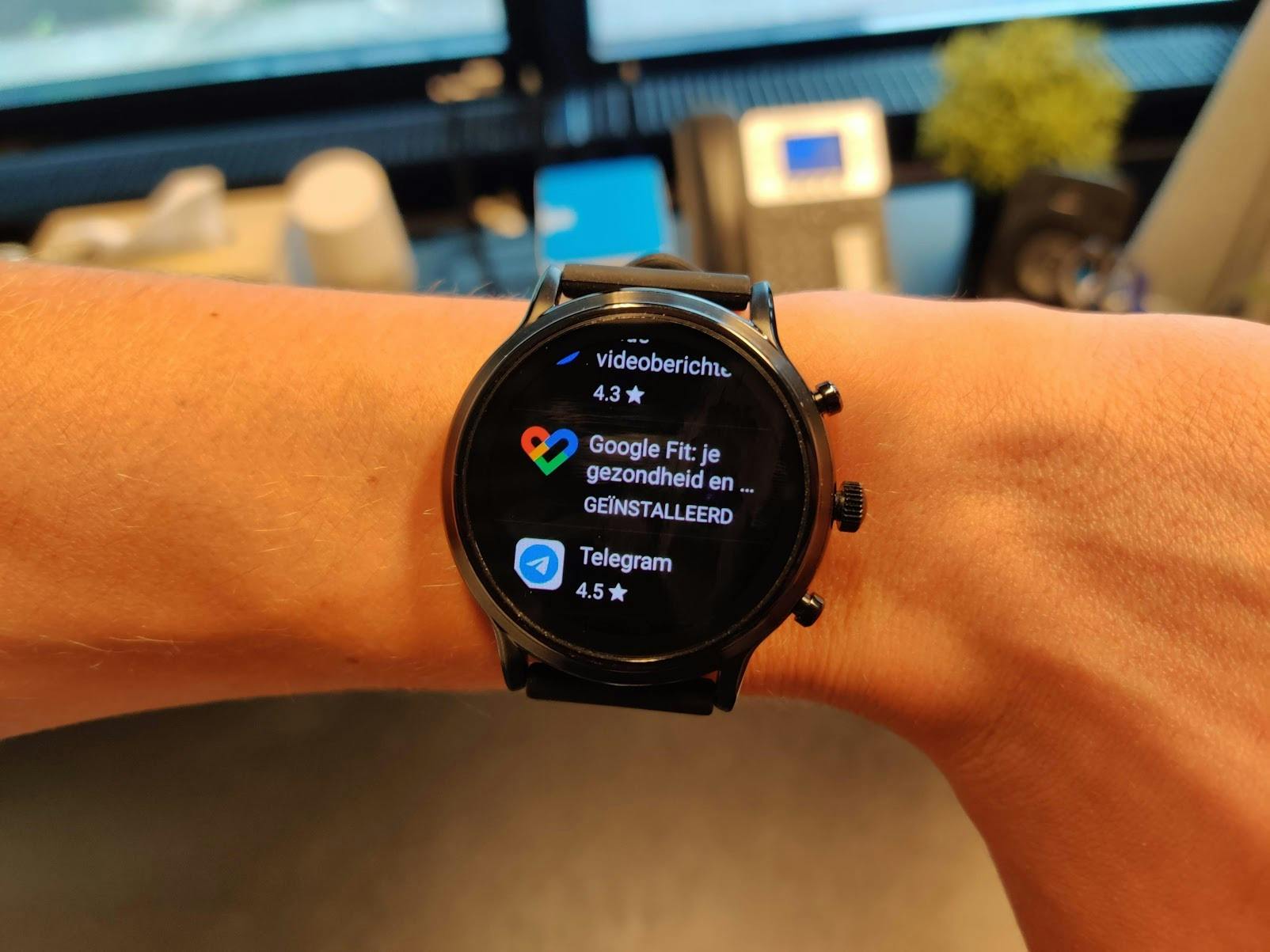 De Wear OS-software is gebruiksvriendelijk. Binnen een uur heb je alles wel onder de knie. Veel aandacht gaat uit naar Google-diensten; begrijpelijk omdat Google Wear OS ontwikkelt. Van Google Fit en de agenda tot de contacten: wie in het Google-ecosysteem zit, kan veel. Het horloge heeft ook standaard-apps als een zaklamp (die het schermpje oplicht en weinig nut heeft), stopwatch, timer en wekker. Je kan extra apps installeren via de Play Store-app op het horloge. Dit geldt ook voor wijzerplaten. Op het horloge en in de bijbehorende Wear OS-app vind je al aardig wat uiteenlopende wijzerplaten.