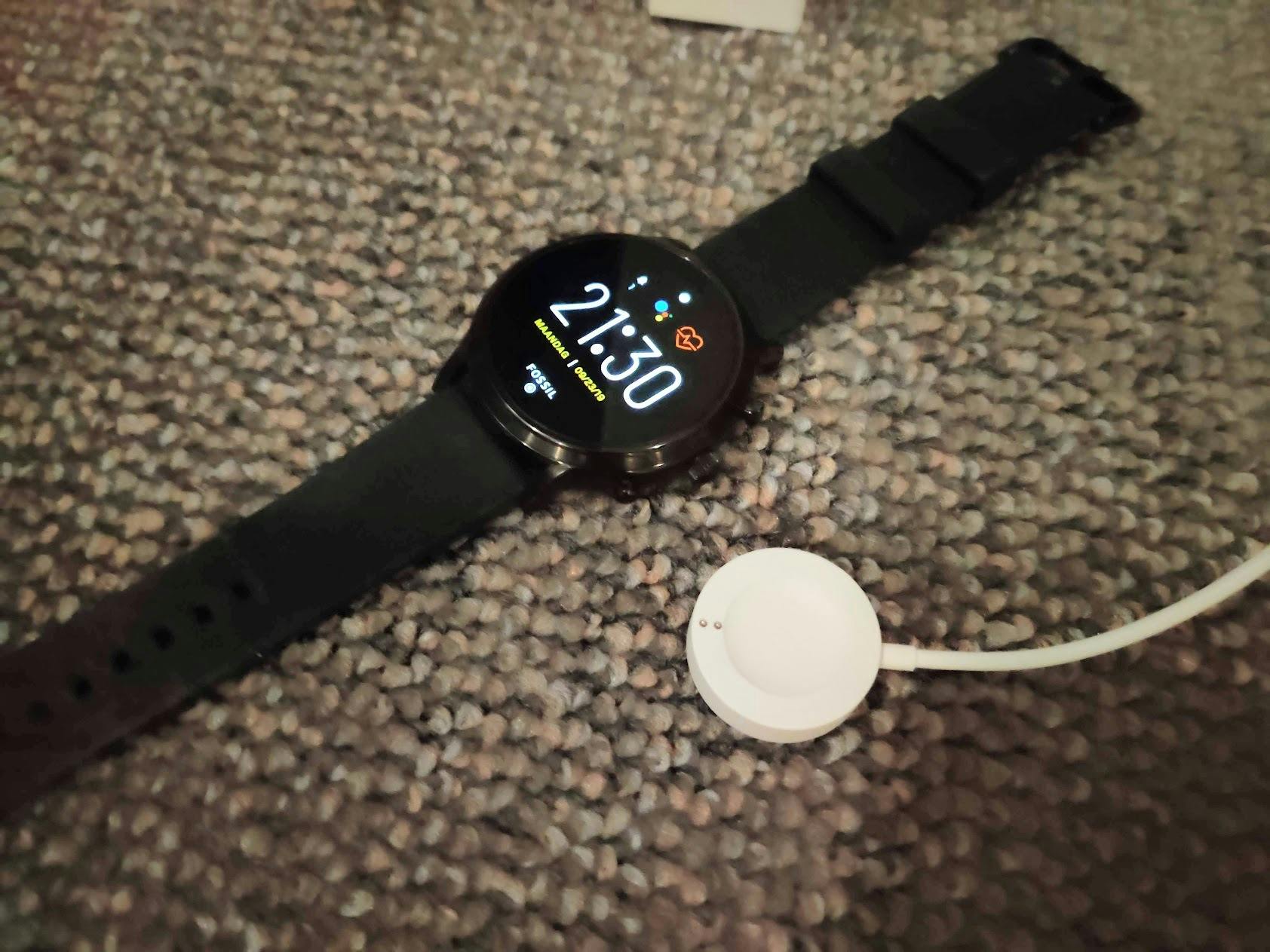 Je laadt de smartwatch op door hem met de onderkant op een magnetisch oplaadstation(netje) te leggen. Het maakt niet uit hoe je het horloge plaatst. De kabel van het oplaadstation is één meter lang. De oplaadmethode werkt prima: binnen een uur gaat de Gen 5 van 0 naar bijna 80 procent. Het was echter fijner geweest als je het horloge draadloos via de qi-standaard kon opladen, de manier waarop ook duurdere smartphones, Samsung-smartwatches en de AirPods 2019 opladen. Nu ben je afhankelijk van een door Fossil ontwikkelde oplaadmethode, wat extra vervelend is omdat het horloge bij normaal gebruik slechts één tot twee dagen meegaat. Toen ik onverwachts een nacht niet thuis sliep, was mijn horloge ’s ochtends bijna leeg en kon ik hem niet opladen. Je kan een extra oplader kopen en die bijvoorbeeld in je tas stoppen, maar dan ben je dertig euro armer.