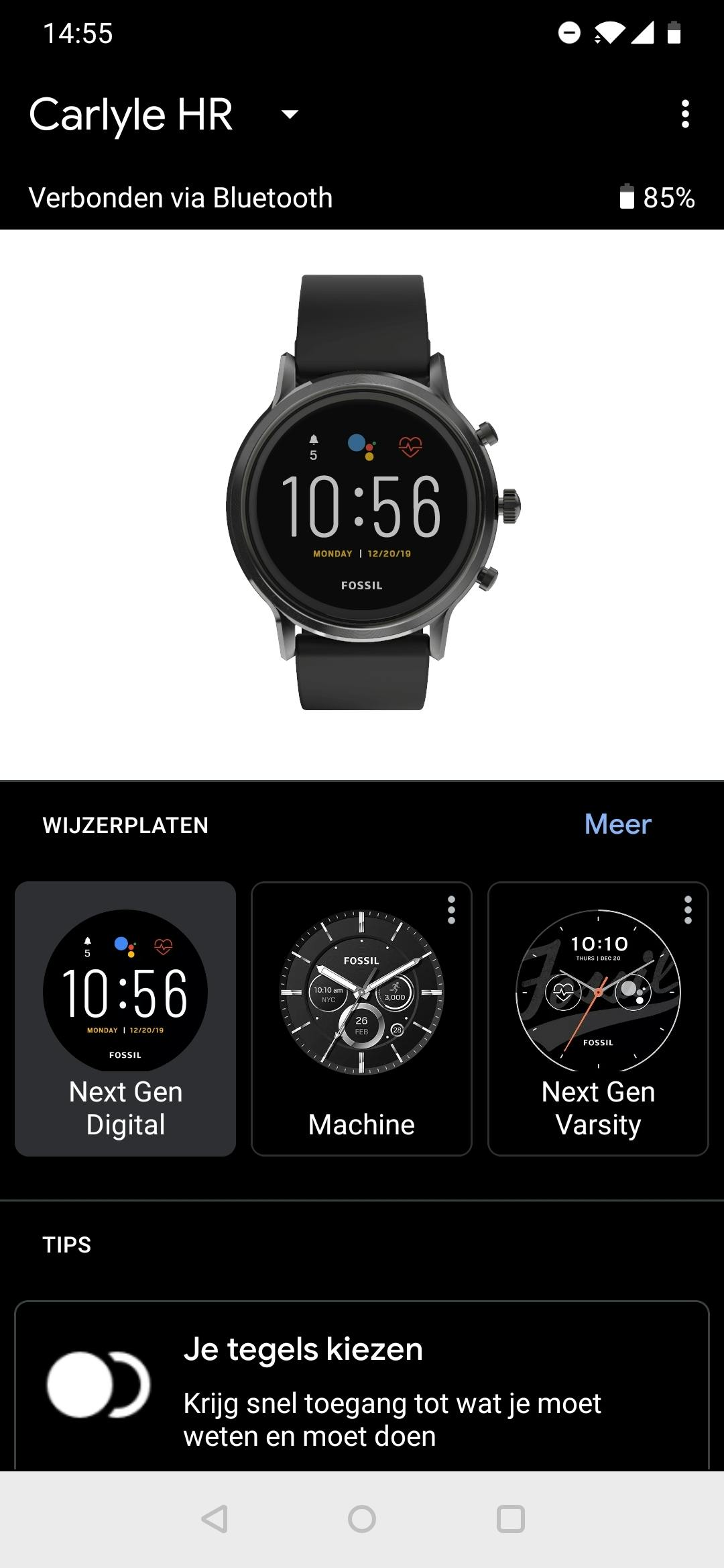 Om terug te komen op de accuduur: die is met de standaardmodus niet bijzonder. De afgelopen week lukte het me telkens net niet om de batterij op één dag (07:00 tot 23:00) leeg te krijgen en had ik nog zo’n twintig procent over. Ik moest het horloge dus elke nacht of ochtend opladen. Wil je een langere accuduur dan kan je een zuinigere modus activeren. Denk aan de modus ‘uitgebreid’, waarmee de smartwatch volgens Fossil een paar dagen meegaat omdat accu-intensieve features alleen worden ingeschakeld als je ze nodig hebt. Je kunt ook een aangepaste modus creëren en allerlei features aan en uit zetten. Fijn dat het kan, maar de Fossil Gen 5 doet dan veel minder en verliest dus zijn waarde als smartwatch. Is de accu bijna leeg maar je dag nog niet voorbij, dan kan je de modus activeren waarbij het scherm alleen de tijd toont. Dit rekt de batterijduur een paar uur.