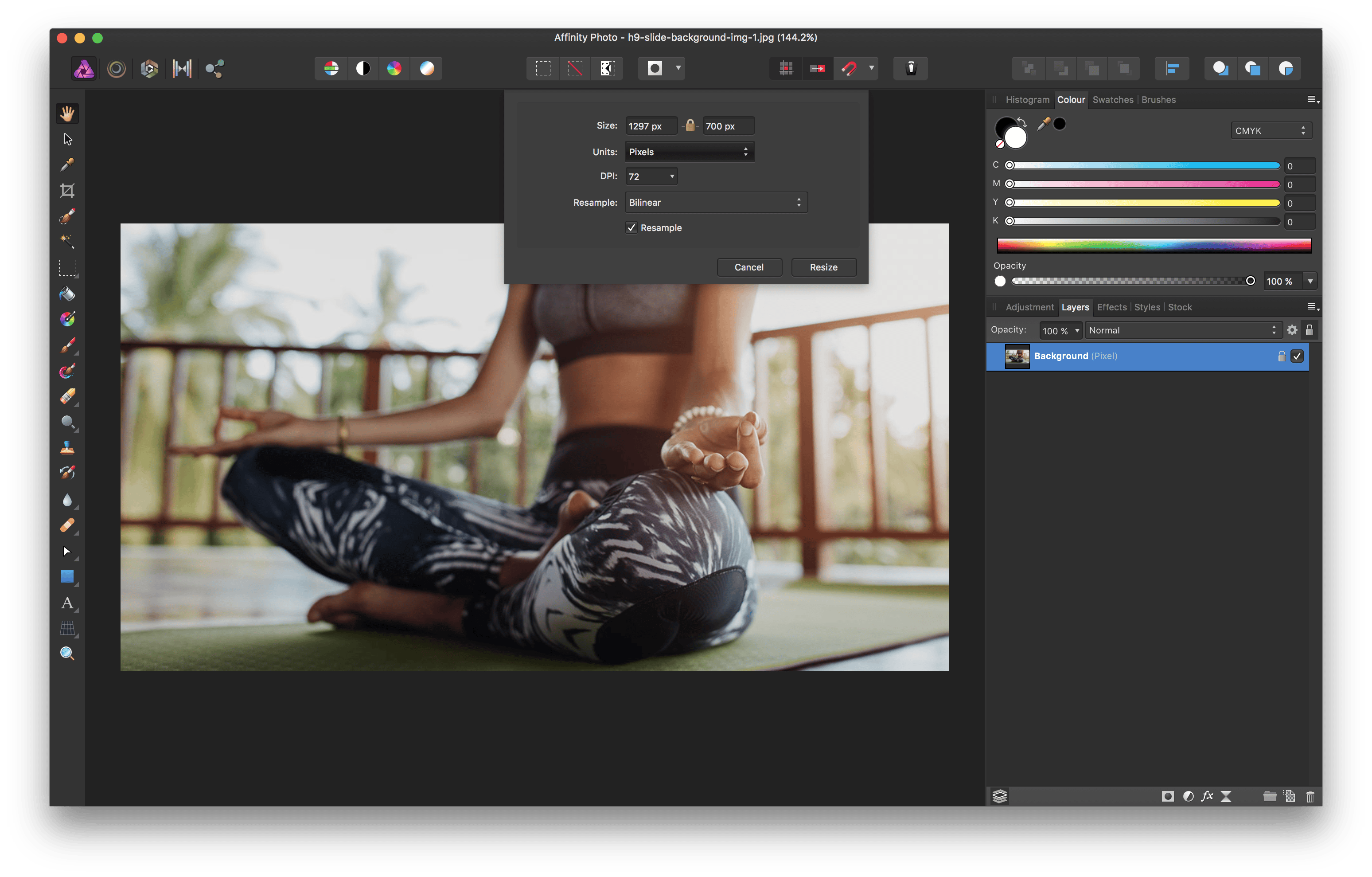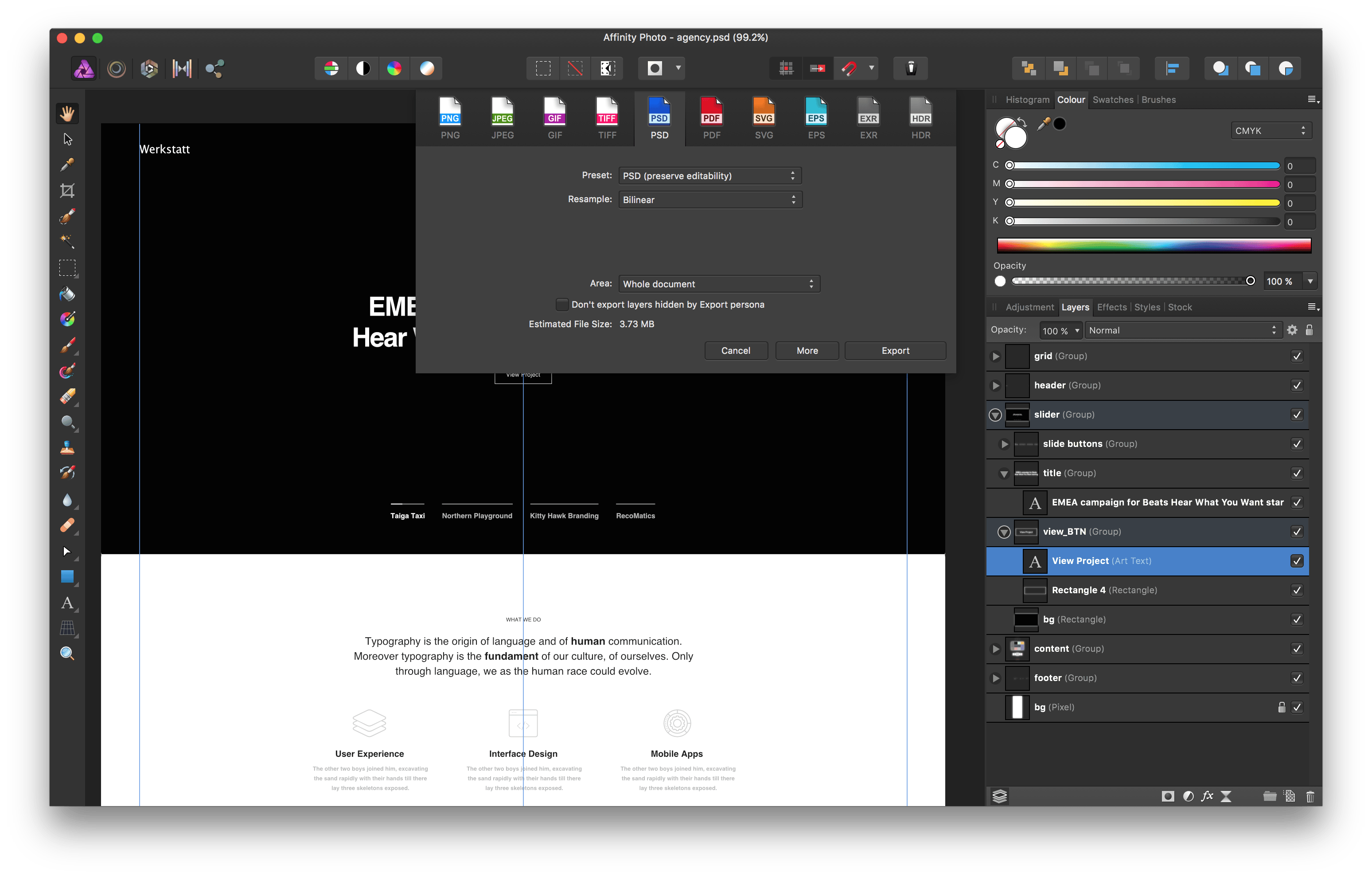 Affinity Photo kan Photoshop-bestanden openen en je kunt zelfs Affinity-projecten weer opslaan in het psd-formaat van Adobe. In bijna alle gevallen herkent het programma de verschillende lagen, groepen en gebruikte lettertypen van het psd-bestand en kun je verder werken aan de psd zoals je in Photoshop CC gewend bent. Een Affinity-project heeft de extensie afphoto. Als je het bestand weer als psd wilt opslaan, ga je naar File / Export en kies je voor PSD. Je hebt de keuze uit Preserve accuracy en Preserve editability. Kies de laatste als je wilt dat je teksten in een ander programma zoals Photoshop CC nog kunt bewerken.