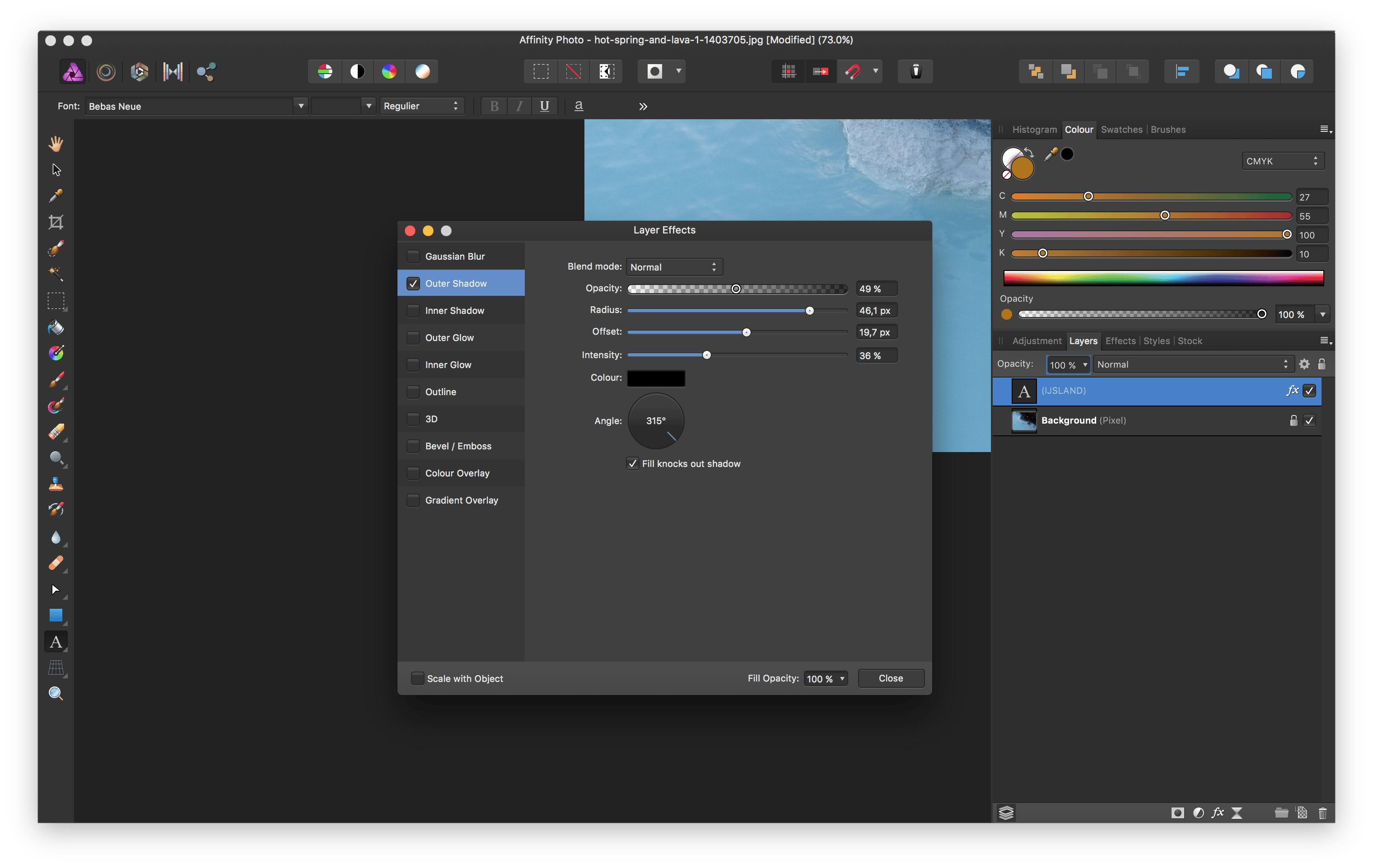 Als je bekend bent met Photoshop, weet je hoe je met lagen werkt. In Affinity Photo werkt dit vrijwel hetzelfde. Je kunt de doorzichtigheid van een laag aanpassen door rechts in de Studio bij Layers een laag te selecteren en de schuif onder Opacity aan te passen. Om een effect aan een laag toe te voegen, klik je op fx onderin. Zet een vinkje voor een effect en pas de waardes aan. Je ziet dat je laag meteen wordt veranderd. Sluit af door op Close te klikken. Elk effect heeft ook zijn eigen Opacity-schuif.