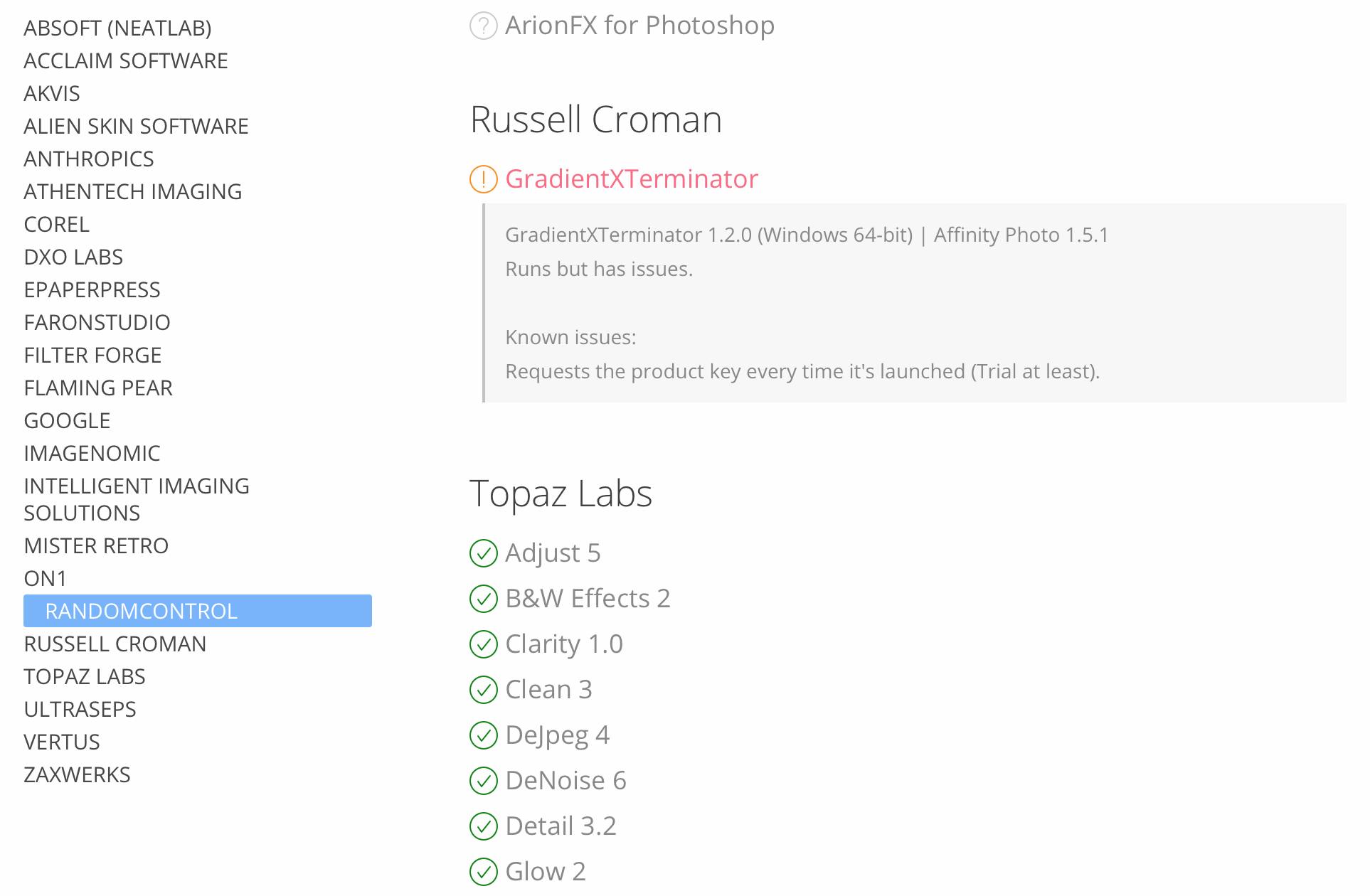 Heb je niet genoeg aan de filters van Affinity Photo, dan kun je plug-ins installeren. Het programma ondersteunt veel plug-ins die eigenlijk voor Photoshop zijn gemaakt, een volledig overzicht vind je hier. Een ondersteunde plug-in heeft een groen vinkje, een oranje uitroepteken betekent dat het in principe werkt, maar met beperkingen. Een kruisje betekent dat het niet werkt in Affinity Photo. Plug-ins die nog niet zijn getest, hebben een vraagteken. Hoe je plug-ins installeert, lees je in de handleiding bij Filters and effects / Using plugins.