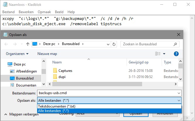 Onze opzet: we willen alle nieuwe of gewijzigde data uit een of meer mappen met een muisklik laten back-uppen naar een verwijderbaar medium (zoals een usb-stick). Daarna wordt dat medium automatisch losgekoppeld zodat ransomware er niet bij kan. Voor deze automatische loskoppeling zorgt USB Disk Ejector. Pak het zip-bestand uit en plaats het exe-bestand in bijvoorbeeld de map C:\usbde. Vervolgens open je Kladblok en tik je (iets als) de volgende tekstregels in: