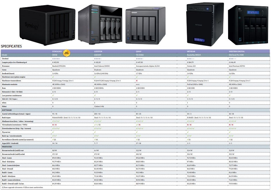 Wij geven de consumenten die steeds vaker een 4bay-nas helemaal gelijk, er is namelijk veel moois te koop. Western Digital en vooral Netgear hebben moeite de concurrentie bij te benen. Hoewel zij zeker geen slechte nas leveren, zijn beide apparaten minder flexibel dan die van de concurrenten. Het is lastig een winnaar aan te wijzen uit de andere drie. Asustor biedt met de AS6104T ongekend veel hardware voor het geld. Daarvoor moet je de toch nog altijd mindere besturingssoftware en het mindere aanbod aan uitbreidingen voor de nas op de koop toenemen. Daar bewijzen vooral de QNAP TS-431X2 en de Synology DS418 hun kracht. Hoewel de hardware van de QNAP TS-431x2 enkele leuke features kent, doet het ontbreken van hardwarematige transcoderen toch afbreuk. Dan scoort Synology beter, geen compromissen bij de software en met de hardware een flinke stap vooruit. De DS418 is daarom de winnaar van de test.