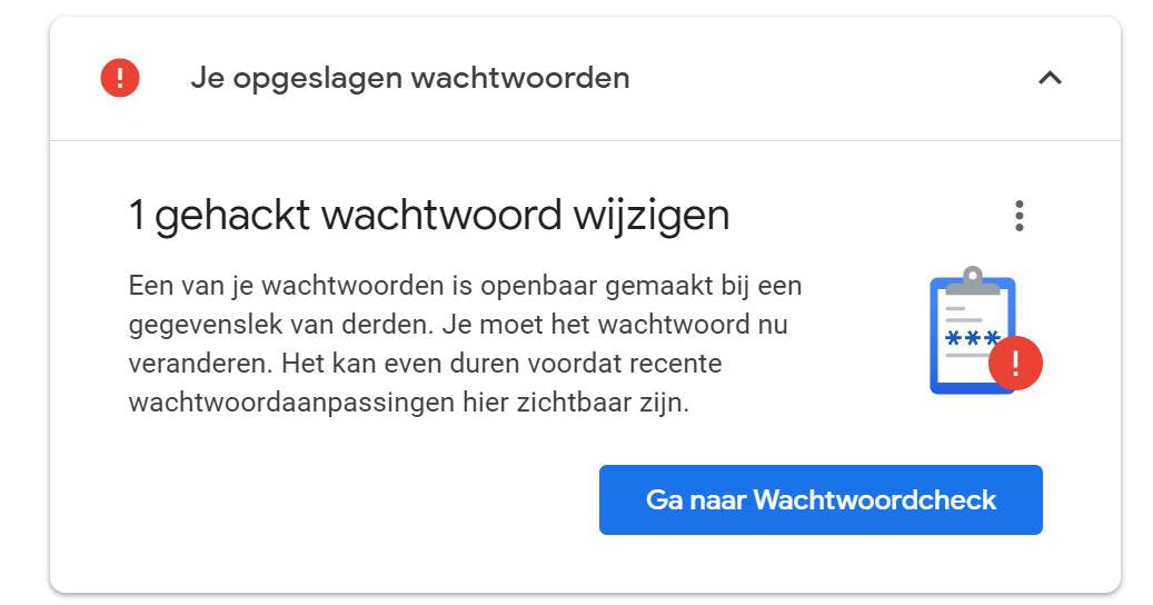 Mogelijk krijg je van Google een seintje dat er in het verleden wachtwoorden gelekt zijn. Klik op Ga naar Wachtwoordcheck, daarna op Wachtwoorden checken en vul het wachtwoord van je Google-account in. Je ziet nu welk wachtwoord bekend is geworden en gaat via de knop Wachtwoord wijzigen naar de website om je wachtwoord te wijzigen.