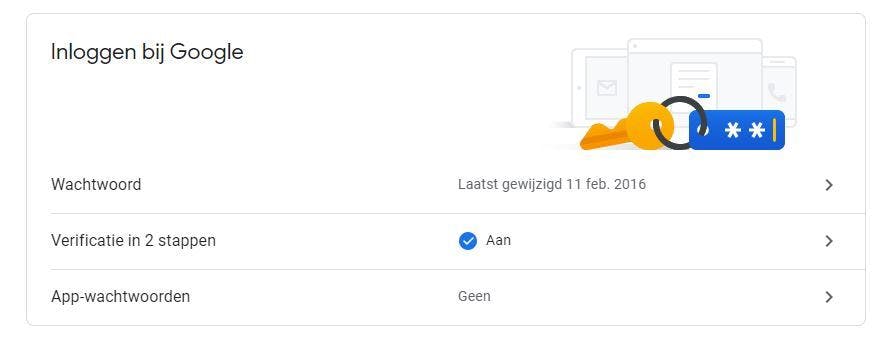 De belangrijkste manier om je Google-account extra te beveiligen, is door de tweestapsverificatie in te schakelen. Als jij op een onbekend apparaat probeert in te loggen met je e-mailadres en wachtwoord, vraagt Google om een extra beveiligingsvorm. Bijvoorbeeld om een code die je per sms of app ontvangt of door de inlogpoging op een vertrouwd apparaat te bevestigen.