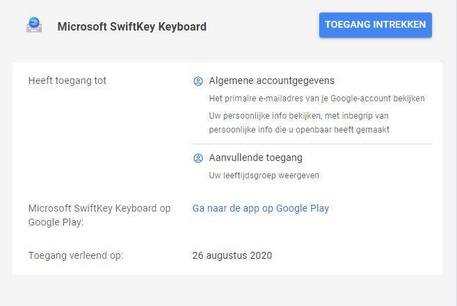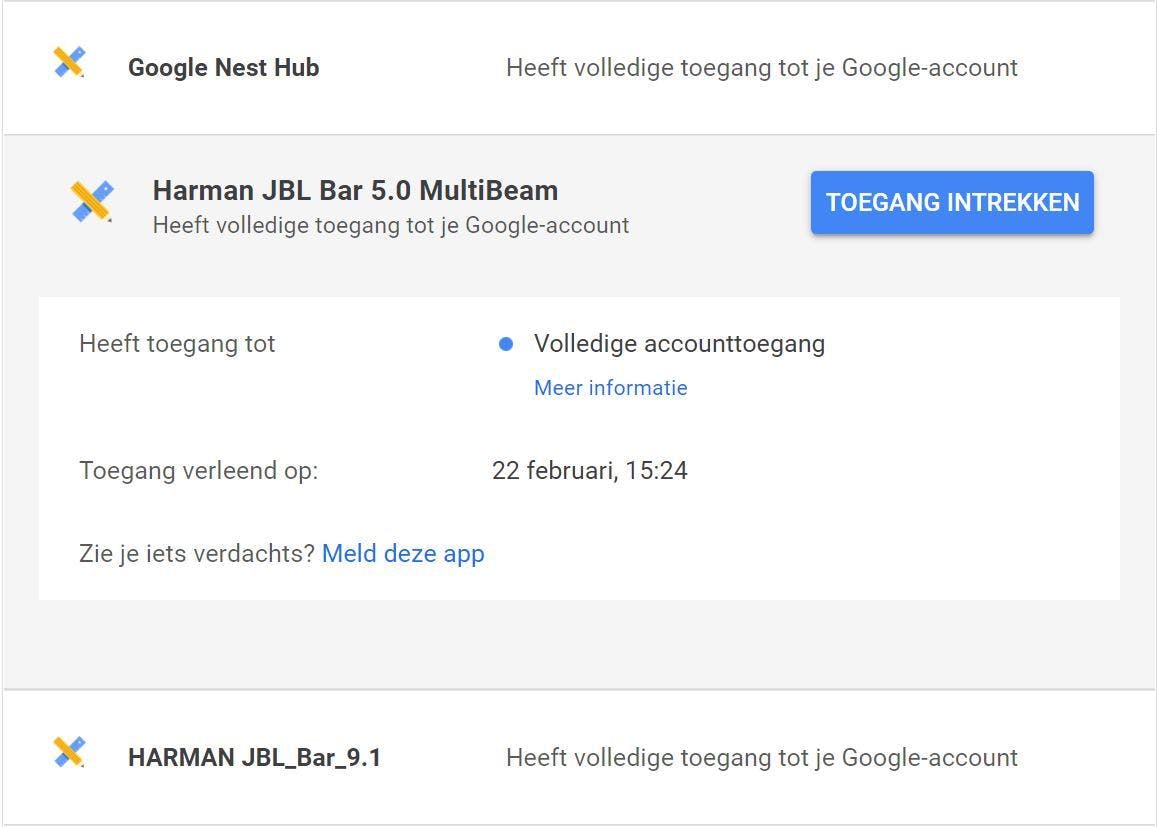 Je hebt hier zelf toestemming voor gegeven, maar Google raadt je aan om de lijst regelmatig door te nemen om te kijken of je de apparaten en diensten nog gebruikt en vertrouwt. Zo niet, dan trek je de toestemming eenvoudig in.