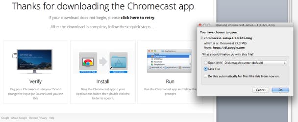 Als je in een Chrome-browser zit op een tablet of laptop, moet je eerst een app installeren die je helpt met de installatie van de Chromecast. Zit je op een Mac, dan is het natuurlijk net weer even anders en kom je nog op een tussenstap terecht, zie het screenshot hieronder.
