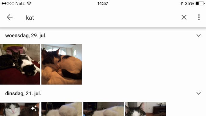 Tik op het vergrootglas rechts onderin om toegang te krijgen tot de zoekfunctie van Google Foto's. Typ in het zoekvenster bijvoorbeeld kat in en de app laat je alle foto's zien waarop een kat is afgebeeld. Dit werkt vrij goed: van de acht kattenfoto's in onze filmrol mist Google er maar twee. Als je de app net hebt geconfigureerd, heeft Google nog niet alle foto's verwerkt en kun je nog niet zoeken. Als je wilt weten hoe lang het uploaden nog duurt, veeg dan tot je bij de pagina Assistent uitkomt. Bovenaan zie je hoeveel foto's nog moeten worden geüpload.