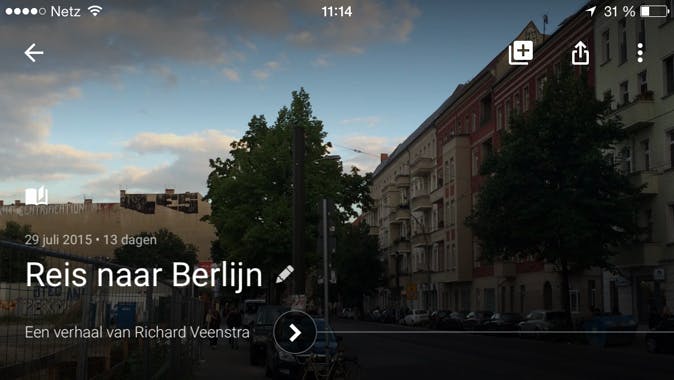 Veeg naar links om op de pagina met je verzamelingen te komen. Verzamelingen kunnen albums zijn, maar ook verhalen of video's. Een verhaal is een soort digitaal fotoboekje, tik op de verzamelingenpagina op het plusje en kies voor Verhaal. Selecteer minimaal vijf foto's of video's en tik op Maken. De app verzint zelf een titel gebaseerd op locatie-informatie van je foto's en video's en geeft deze in een mooi vormgegeven slideshow weer. Wijzig de titel door op het potloodje te tikken en voeg beschrijvingen aan foto's en video's toe door op het driehoekje onderin te tikken. Bovenin kun je op de deel-knop tikken en je verhaal delen via de bekende kanalen.